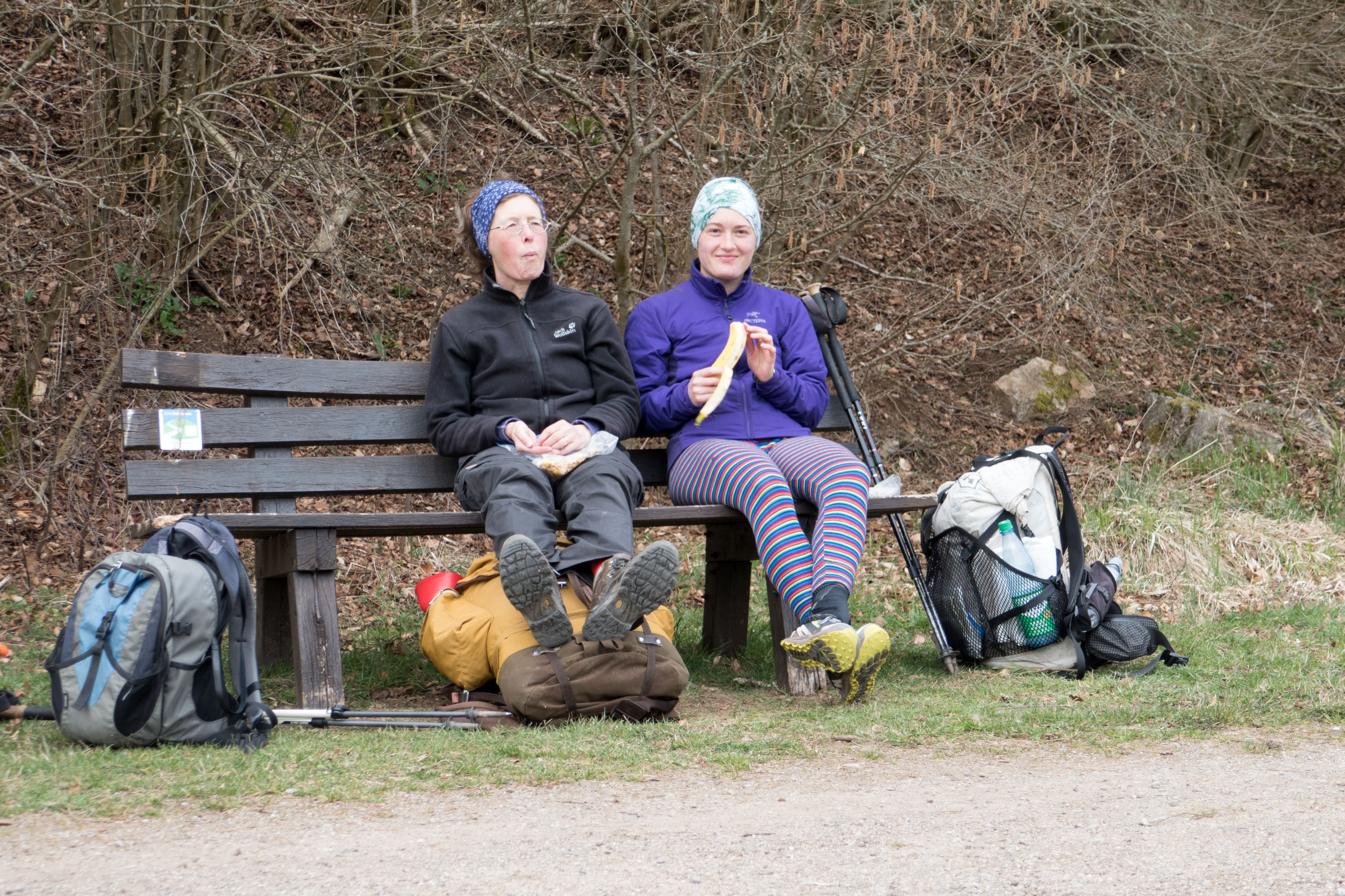 Mein Knie fängt an, beim Abwärtsgehen zu schmerzen. Trotzdem schaffen wir heute über 30km. Wir schlafen in der Grillhütte „Heimatblick“, tatsächlich mit wunderbarer Aussicht auf die im Tal liegenden Dörfchen und Felder. Wie üblich liegen wir ab kurz nach 7 im Schlafsack (dann ist es dunkel und kalt!). Doch schon bald werden wir durch ein heranbrausendes Auto geweckt. Es hält mit quietschenden Reifen, wenige Meter vor unserer Hütte. Ein Jugendlicher steigt aus, verabredet sich hier telefonisch mit Freunden zum Trinken und Feiern. Wir liegen stocksteif da und beten, dass wir unbemerkt bleiben! Nach einer endlosen halben Stunde verlässt den Typen die Geduld, er braust wieder davon. Wir lauschen nun auf jedes Geräusch, erwarten die Rückkehr einer Horde Jugendlicher, schlafen unruhig, aber bleiben zum Glück ungestört.