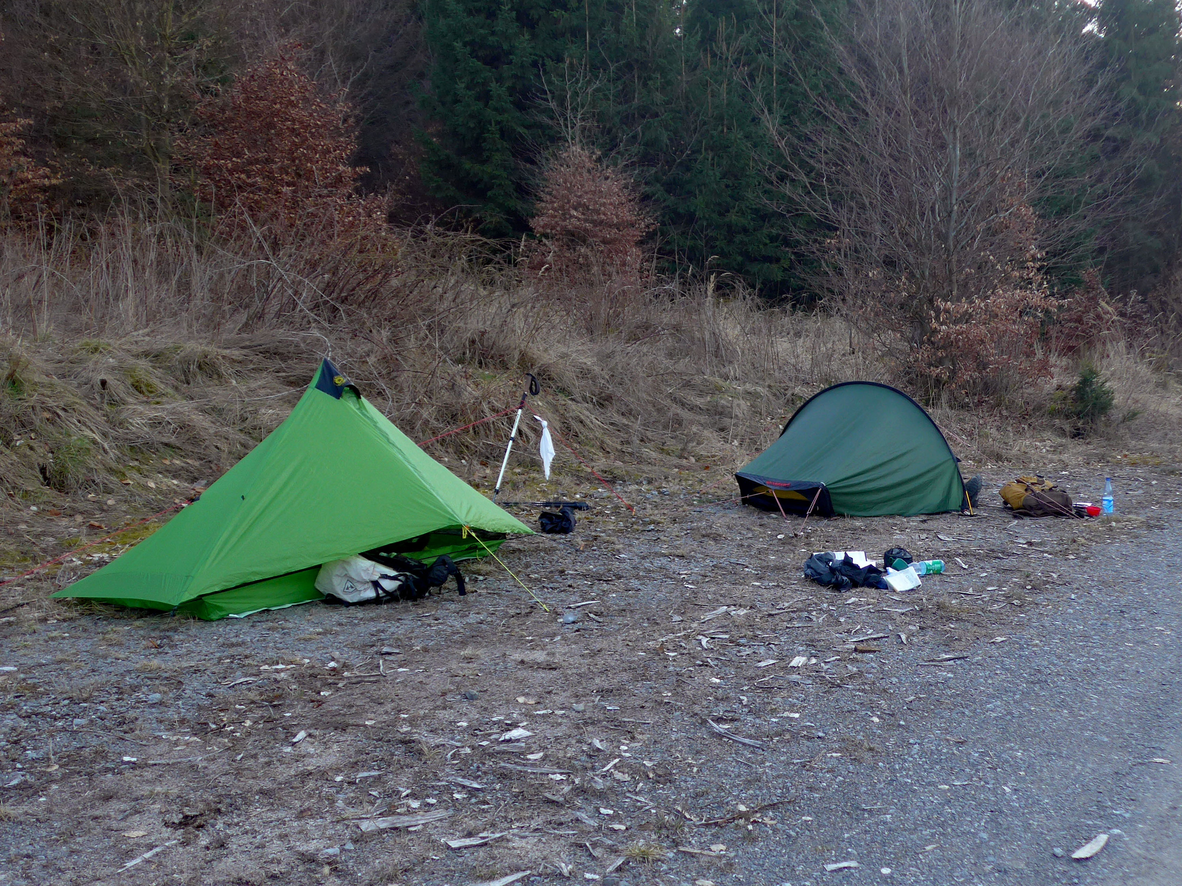 Wir starten also nachmittags am 19.03. in Aachen (Kornelimünster). Der erste Tag führt recht unspektakulär durch Wald und Weideland, aber es ist einfach herrlich wieder zu laufen, unterwegs zu sein! Nach 17km steht kurz hinter dem Dorf Roetgen die erste Nacht an und damit die erste Bewährungsprobe für die neue Ausrüstung! Es wird gut kalt, am Morgen sind die Zelte gefroren.