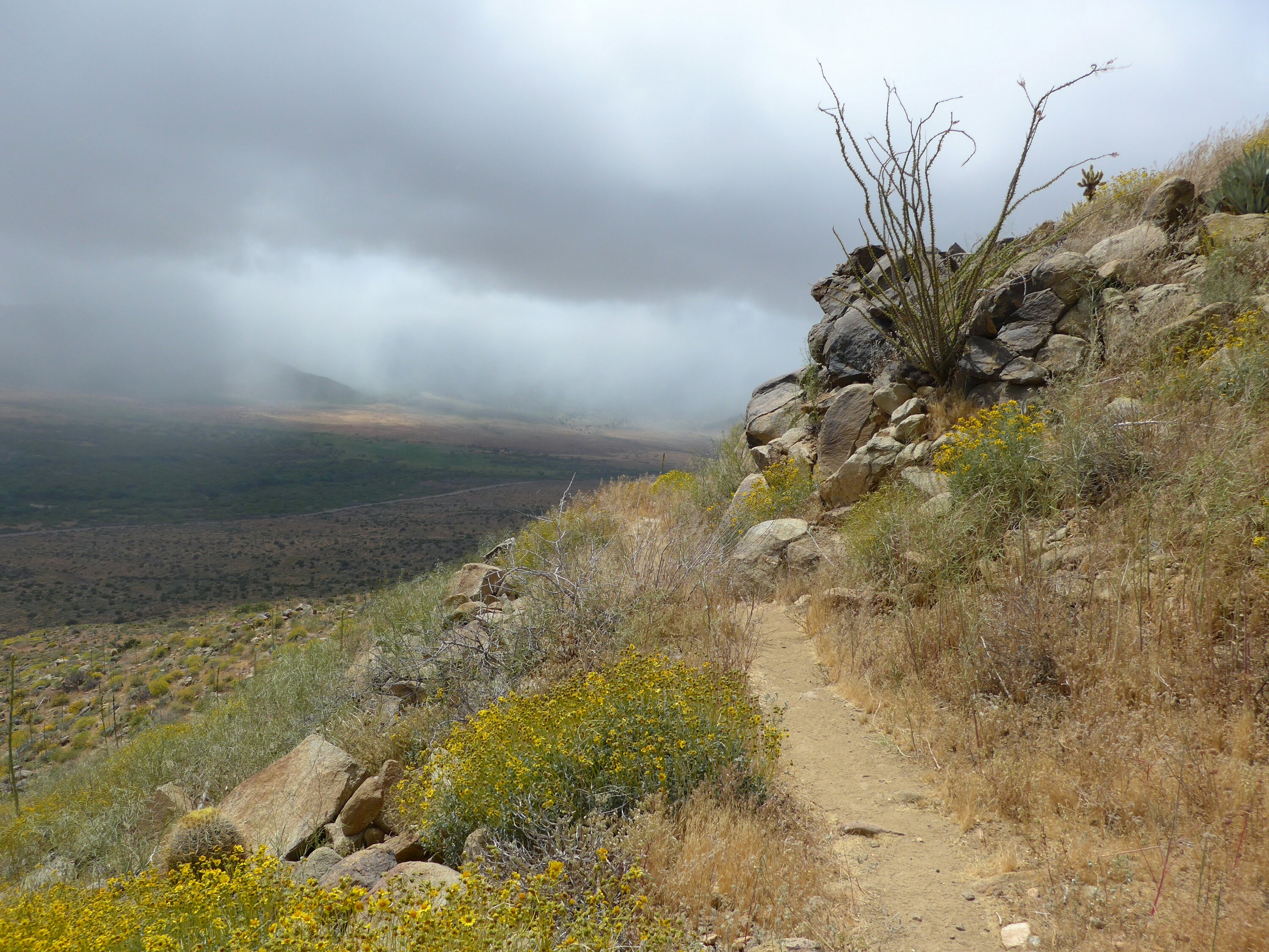 Oben in Julian ist fiesestes kaltes Nieselwetter, zum Glück ist es unten im Tal auf dem Trail trocken. Der Weg führt immer an der Flanke einer Bergkette entlang. Es stürmt wieder mal unglaublich. Ein wenig Schutz bieten die Einschnitte in der Bergflanke, in die man immer wieder reingeführt wird. Dafür ist die Aussicht auf das Tal und die noch im Regen hängenden Berge auf der anderen Seite toll.