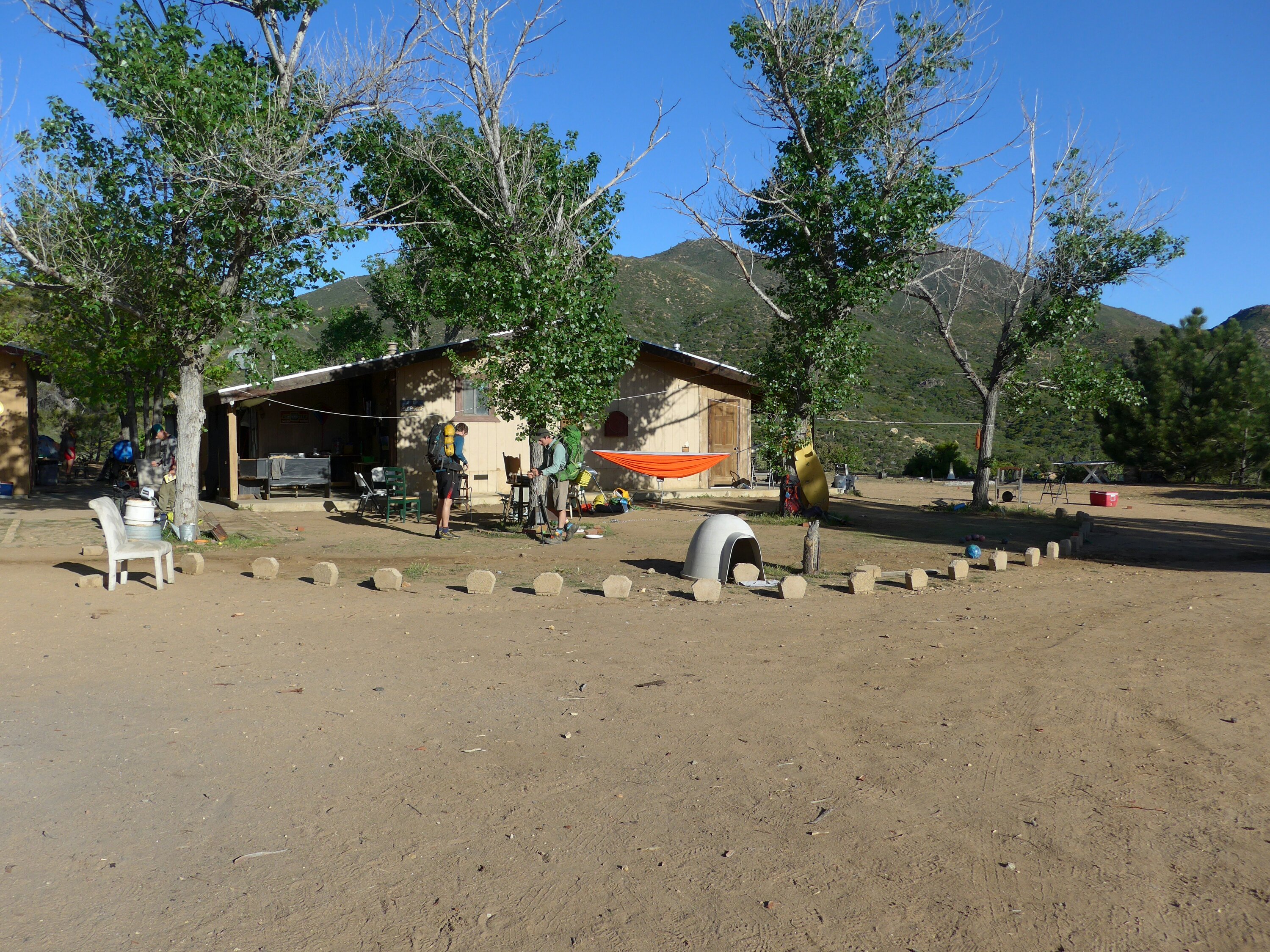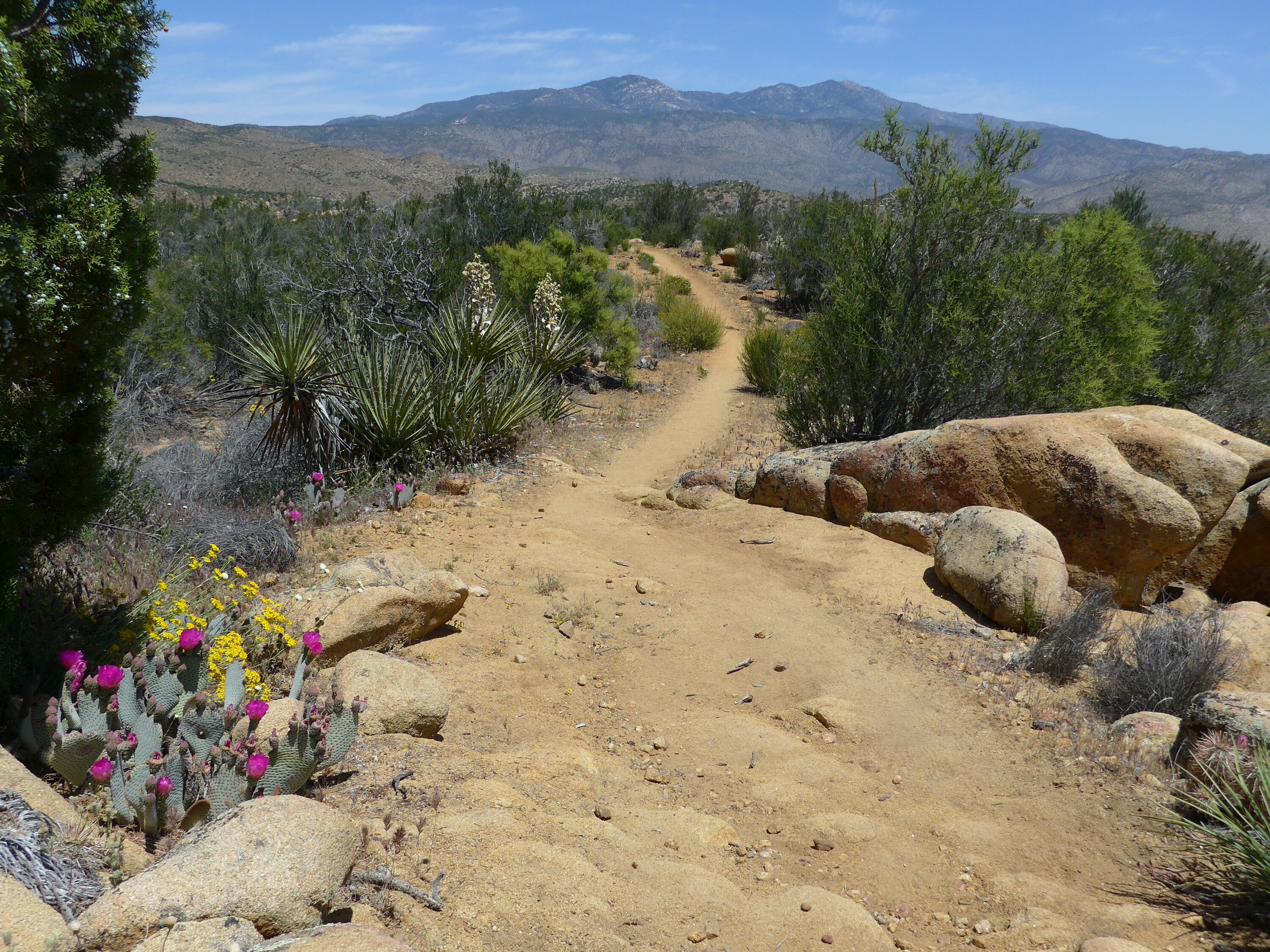 Am nächsten Morgen komme ich in das mini Kaff Warner Springs. Das hiesige Community Centre bietet seine Sanitäranlagen und eine kleine Auswahl an Lebensmitteln zum Verkauf an. Außerdem ist hier gerade der „mobile Outdoor-laden“, der der hiker Masse nach Norden folgen wird. So kann ich direkt meinen zerbrochenen Löffel ersetzen. Ich treffe einige Hikerfreunde wieder -sogar einen alten Bekannten vom CDT letztes Jahr, Cruise-, und mache mich nach ein paar faulen Stunden wieder auf den Weg. Die Strecke geht abwechslungsreich durch ein schmales Flusstal, es gibt viel Schatten. In Acht nehmen muss man sich hier vor „poisonous oak“, ein Busch dessen Blätter schlimmen Hautausschlag verursachen. Aus den Tal raus geht es den Rest des Tages stetig bergauf. Es ist warm und ich laufe nur noch stumpf vor mich hin. Erst gegen Abend werde ich aus meinen Trott gerissen: ich komme durch ein riesiges Feld von gelb-roten Steinquadern, dazwischen alles voll blühender Büsche, um die unendliche Insekten und auch Kolibris brummen. Der bisher schönste Abschnitt der Wanderung. Ich zelte zwischen den Steinen. Was für ein toller Tagesabschluss!