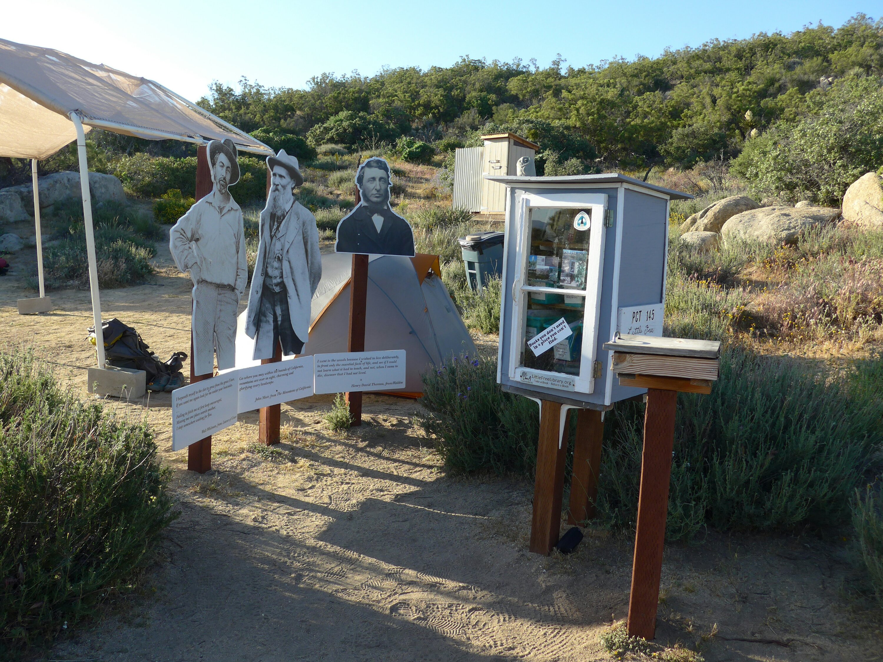 Total groggy komme ich am späten Nachmittag bei „Mary’s place“ an. Sie hat eine wunderbare Oase gebaut, mit Trinkwasser, schattigen Bänken, einer bucket-shower, plumpsklo, und sogar eine kleine Bücherei! Hier bleibe ich, wie so viele andere auch, sodass es ein geselliger schöner Abend wird. Tagsüber laufe ich meistens alleine, treffe aber inzwischen immer wieder die selben Leute. Abends bin ich dann meist ganz gerne auf den populäreren Zeltstellen, sodass ich in Gesellschaft Abendessen kann, und man sich über die Erlebnisse des Tages austauschen kann.