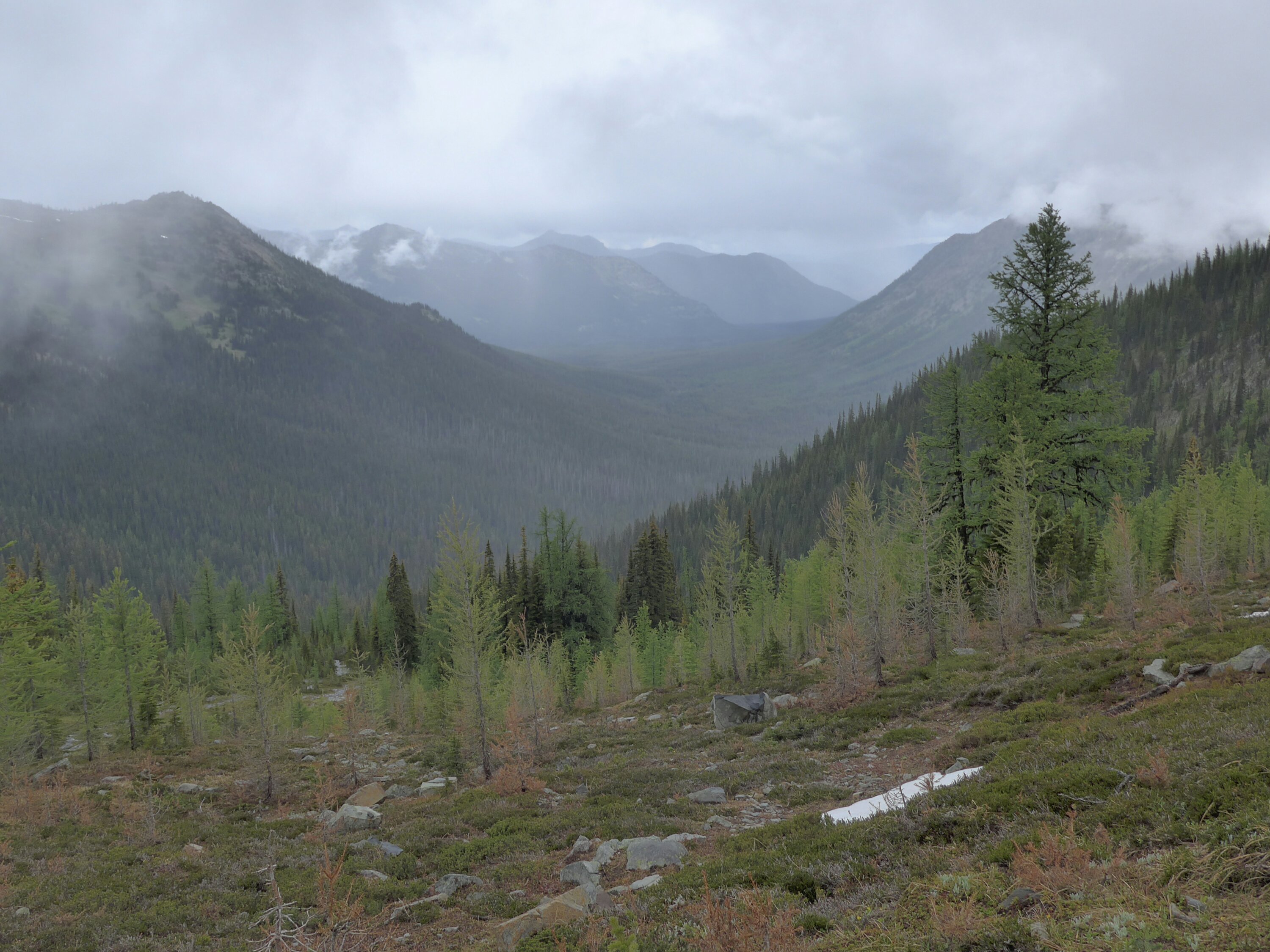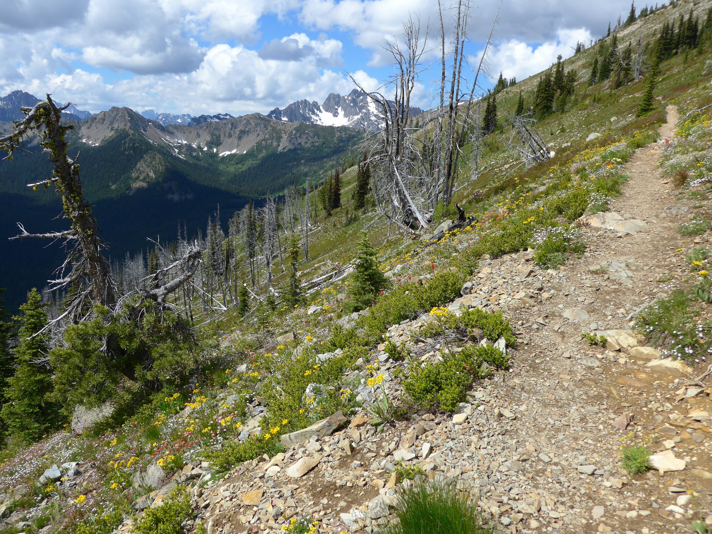 Wir hitchen zu Harts Pass, schon die Schotterstraße hierher ist berühmt und ein Abenteuer für sich! Eng windet sich die von Schlaglöchern übersähte Straße den Berg hoch, links geht es bei Deadhorse Point senkrecht in die Tiefe. Endlich stehen wir wieder am PCT! Erstmal müssen wir 30 Meilen nach Norden laufen, um die amerikanisch-kanadische Grenze ab zu klatschen. Sunny jucken die Füße wohl besonders heftig, schon nach wenigen Minuten verliere ich sie aus den Augen. Der Pfad geht stetig bergauf, ringsum steile Berge, in den Tälern Nadelwald, auf halber Höhe Blumenwiesen, die Spitzen felsig und teilweise noch in Schnee gehüllt. Eine ganz andere Landschaft als die Sierras, aber auch wunderschön! Es ist kühl und bewölkt, aber noch trocken.
