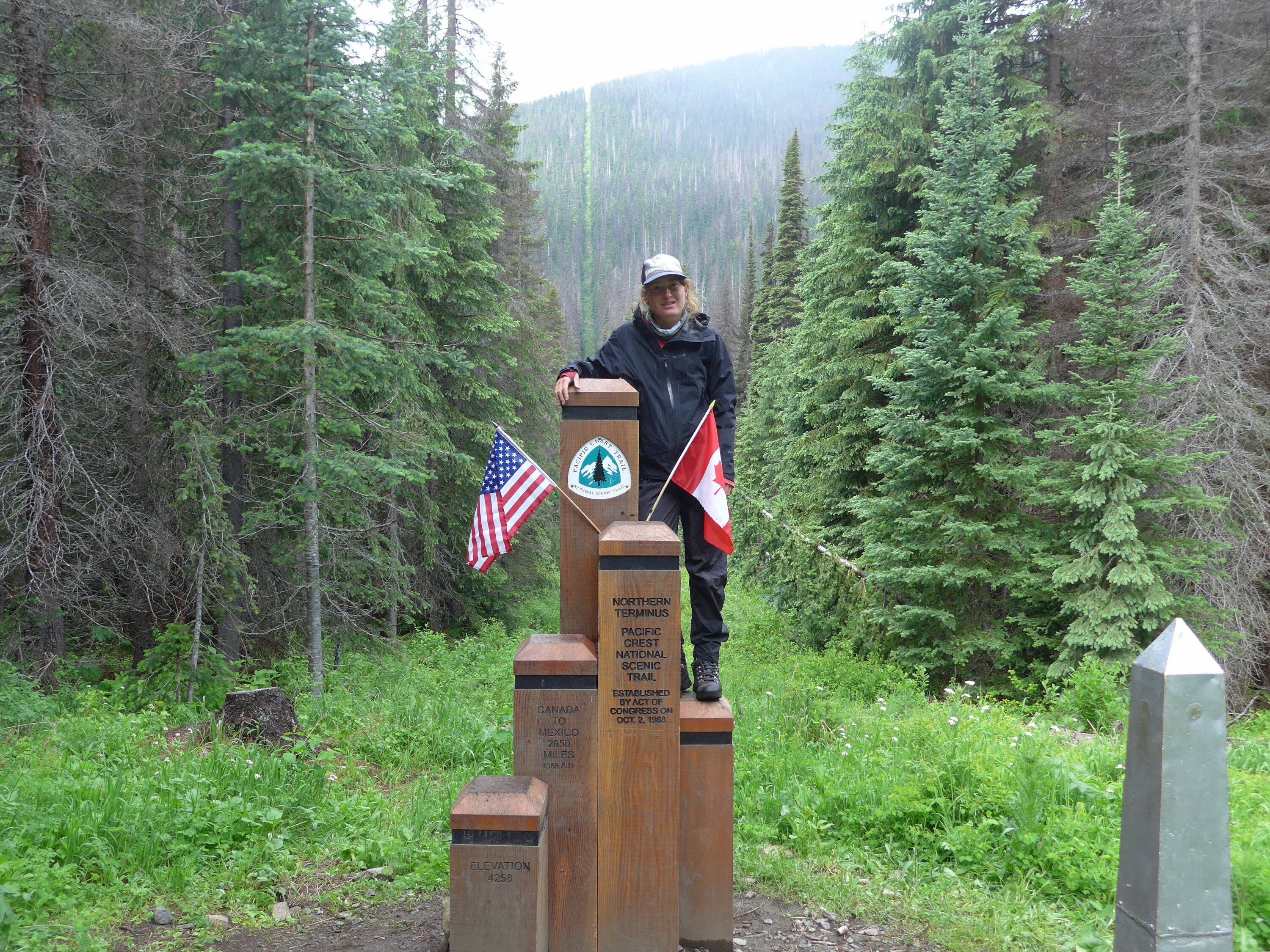 Der Himmel ist verhangen, aber es ist trocken. Zum Glück, denn auch so kostet es schon viel Überwindung, in die nassen Schuhe, Socken, Jacke und Hose zu schlüpfen, kalt! Es geht auf Woody’s Pass hoch, unter mir ein kleiner See. Es sind sogar noch zwei kleine Schneefelder zu queren, aber für mich nach einer Woche Sierras nun kein Problem mehr. Schließlich geht es eine Ewigkeit bergab bis zur kanadischen Grenze. Hier sehe ich die erste Bärenkacke auf dem Trail, und zwar gleich in rauen Mengen! Der Weg ist verwachsen und es liegen einige Bäume quer, eine mühsame Kletterei, bei der ich mir schön das Knie verdrehe… Zur Abwechslung das linke Knie, was sonst ja keine Probleme macht. Endlich an der kanadischen Grenze angekommen werden natürlich jede Menge Fotos gemacht. Den Moment hatte ich mir anders vorgestellt, als krönenden Abschluss meiner Reise. Nun markiert das Monument den Neubeginn der Wanderung Richtung Süden.