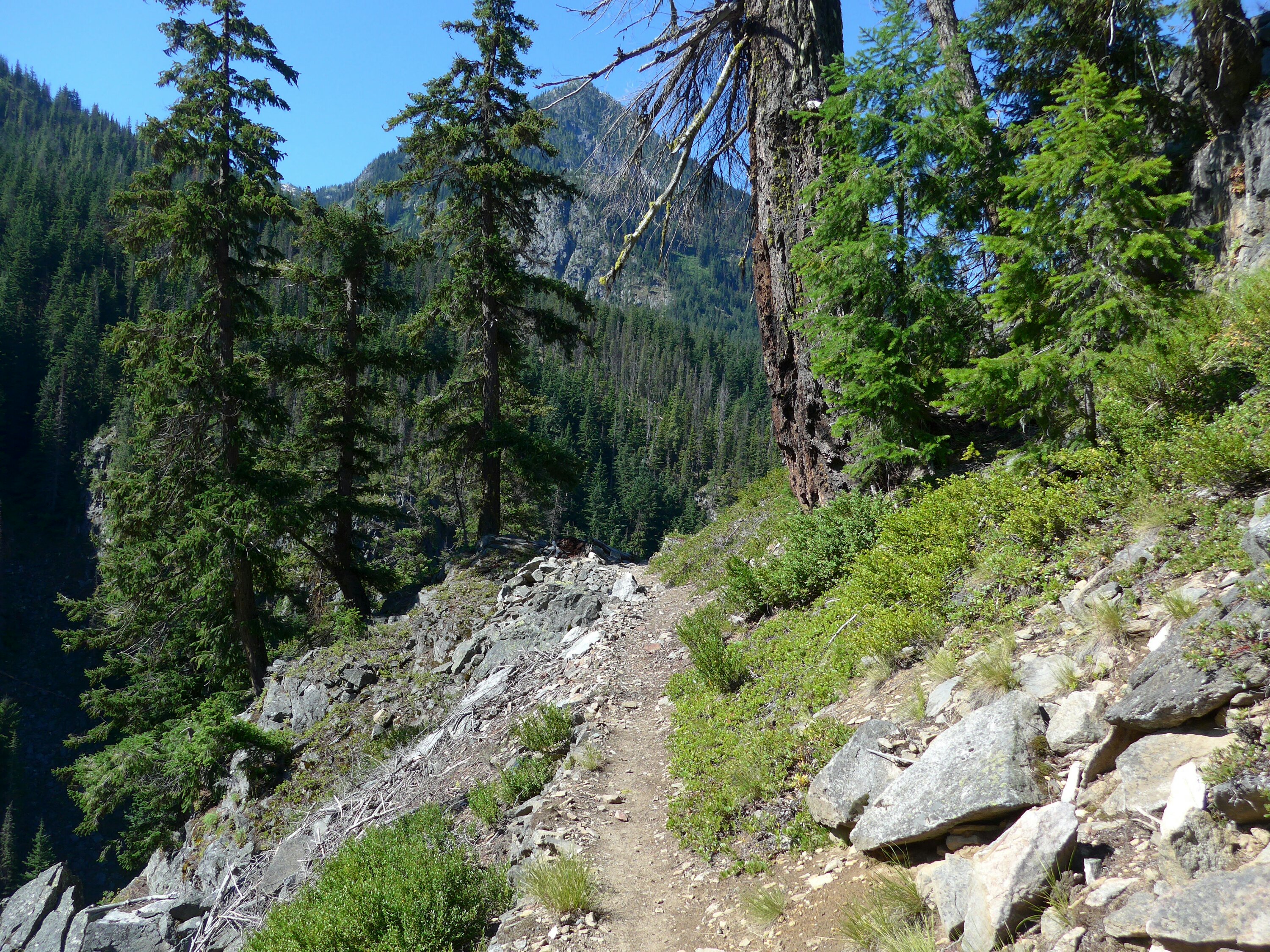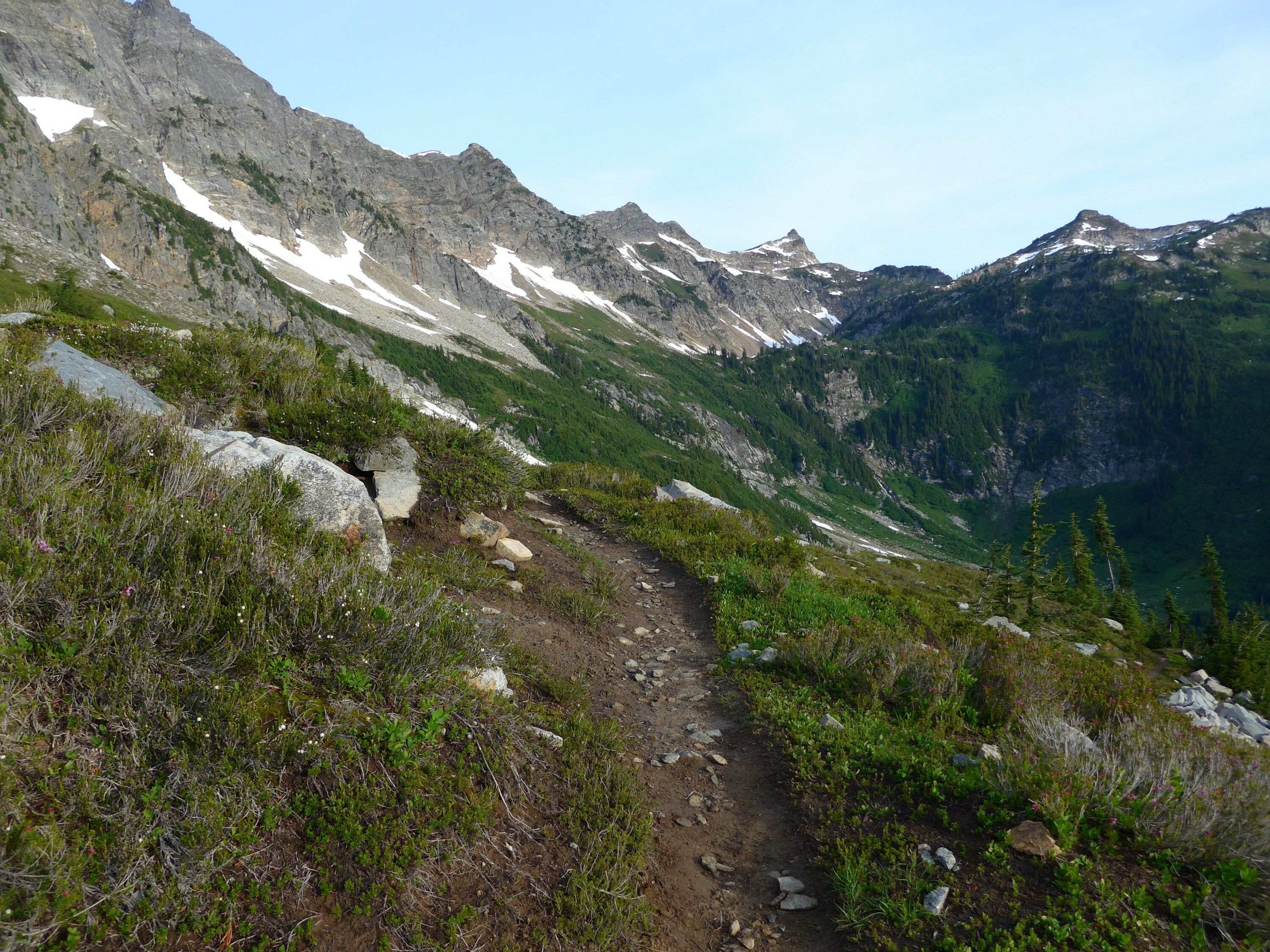 In der Nacht hören wir ein heftiges Rumpeln, ein Erdbeben, wie wir später rausfinden! Am Morgen verlassen wir endlich den Wald und kommen auf alpine Wiesen und Geröllfelder, es gibt wunderbare Aussichten auf die schroffen Berggipfel der North Cascades Range.