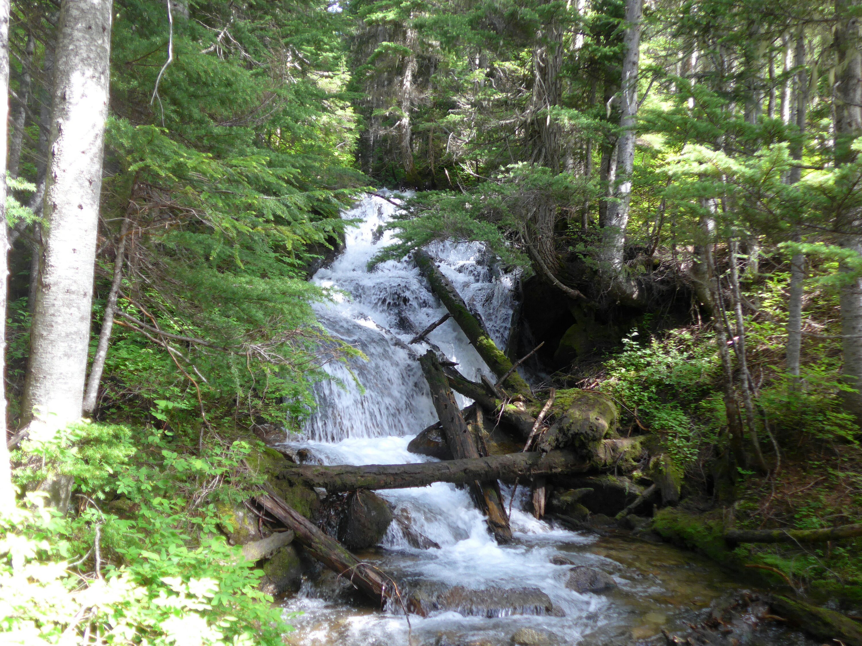 Mein Knie meldet sich wieder deutlich. Dazu kommt nun 8 Meilen bergab, wunderbarer lichter Wald, Flechten behangene Bäume, mit vielen Bächen und Wasserfällen.