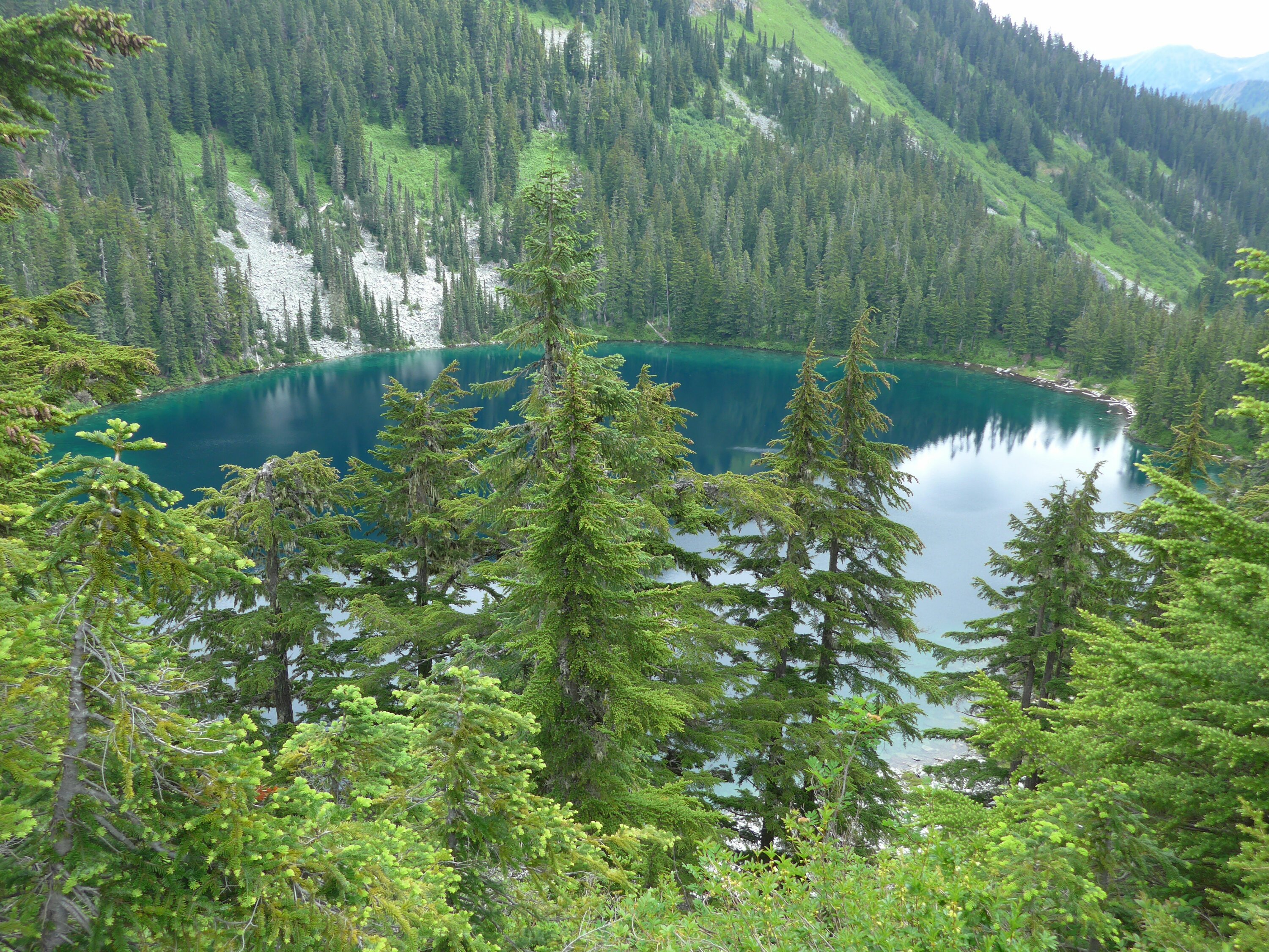 Ich laufe bei Nieselnebel los. Es geht bergauf bis auf den Cathedral Pass, dann in die endlosen Serpentinen runter zum Deep Lake. Mein Knie tut inzwischen gut weh, die Zweifel wachsen. Aber diesmal gibt es kein Zurück, ich mache brav Pausen und Dehnübungen, schlucke mein Ibuprofen, und laufe weiter. Der Wald ist sehr schön, besonders als irgendwann die Sonne herauskommt. Ab mittags laufe ich durch ein Meer von Huckleberry Büschen. Da ich ja eh nicht weit laufe, nehme ich mir viel Zeit massig Beeren zu vertilgen, so lecker!