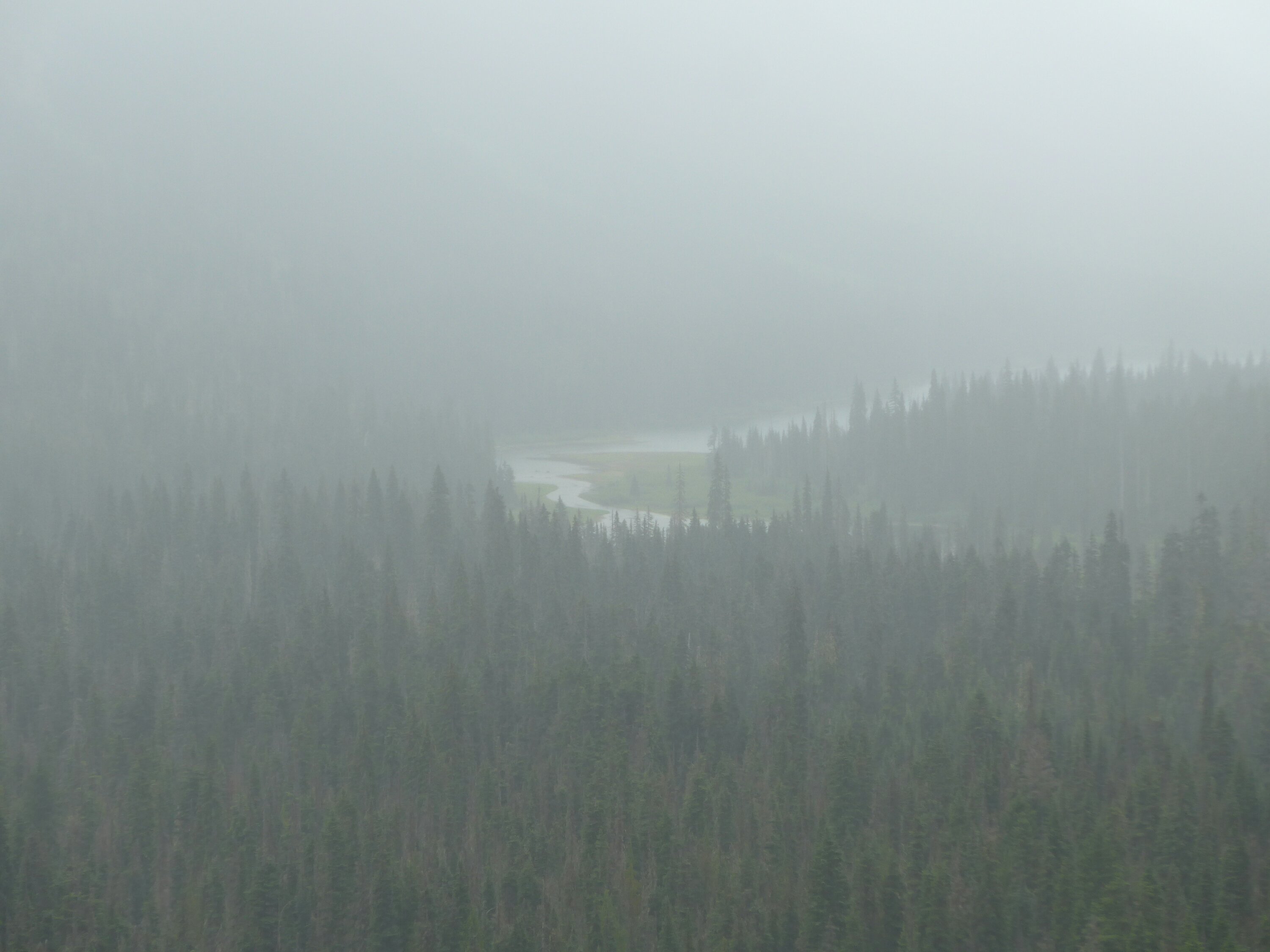 Immer noch regnet es und ist scheußlich kalt. Es kostet viel Überwindung, aus den warmen Schlafsack in die nassen Klamotten zu schlüpfen und mich auf den Weg zurück zu machen. Ich bin tief deprimiert. Ich versuche mich an die Begegnung und meinen Vorsatz vom Vortag zu erinnern, aber in der jetzigen Situation dankbar zu sein, fällt schwer. Schließlich stoppt der Regen, ich biege auf die Abkürzung ab. Der Pfad ist überwachsen und sumpfig, ich folge dem Fluss Deception Creek Richtung Highway. Das Tal ist schön, wild, und einsamer als der PCT.