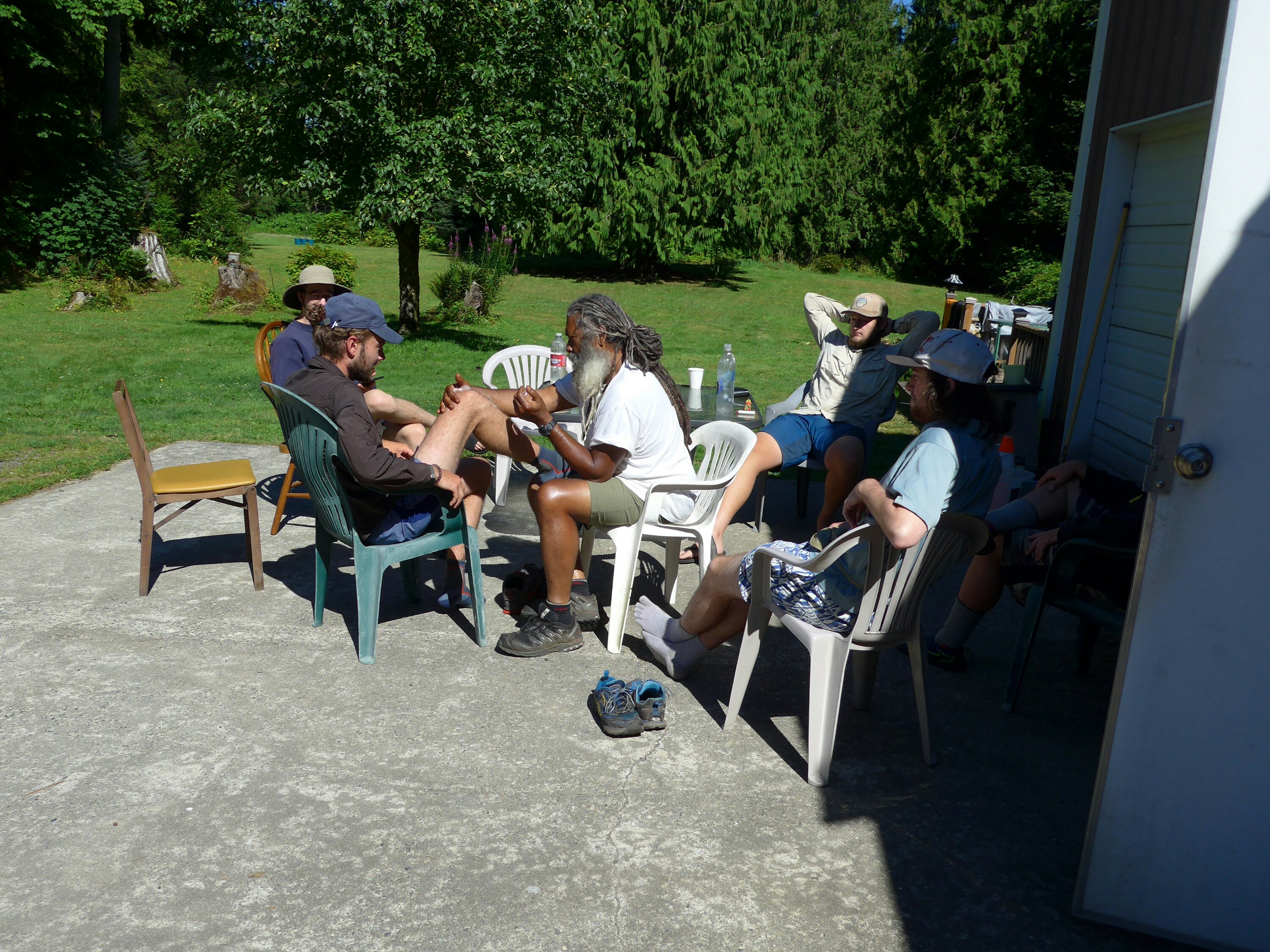 Als ich emotional ziemlich erledigt beim Hiker Heaven ankomme, wartet eine unglaublich Überraschung auf mich: Eine Hikerin ist Physiotherapeutin! Sie kümmert sich sofort um mein Knie, zeigt mir Dehn- und Muskelübungen, erklärt wann ich Pausieren soll, und ermuntert mich weiter reichlich Ibuprofen zu nehmen, um die Entzündung zu hemmen. Auch ermuntert sie mich, nicht aufzugeben. Ich bin unendlich dankbar!! Als sie am nächsten Tag weiterläuft, kommt meine zweite Rettung: Dock ist Hiker und ein US-Army Veteran, der in der Krankenversorgung gearbeitet hat. Er kennt sich auch gut mit Knie und Muskelproblemen aus und gibt mir, und jedem anderen der sich traut, täglich eine Beinmassage. Dabei geht man zwar fast an die Decke, aber es hilft!