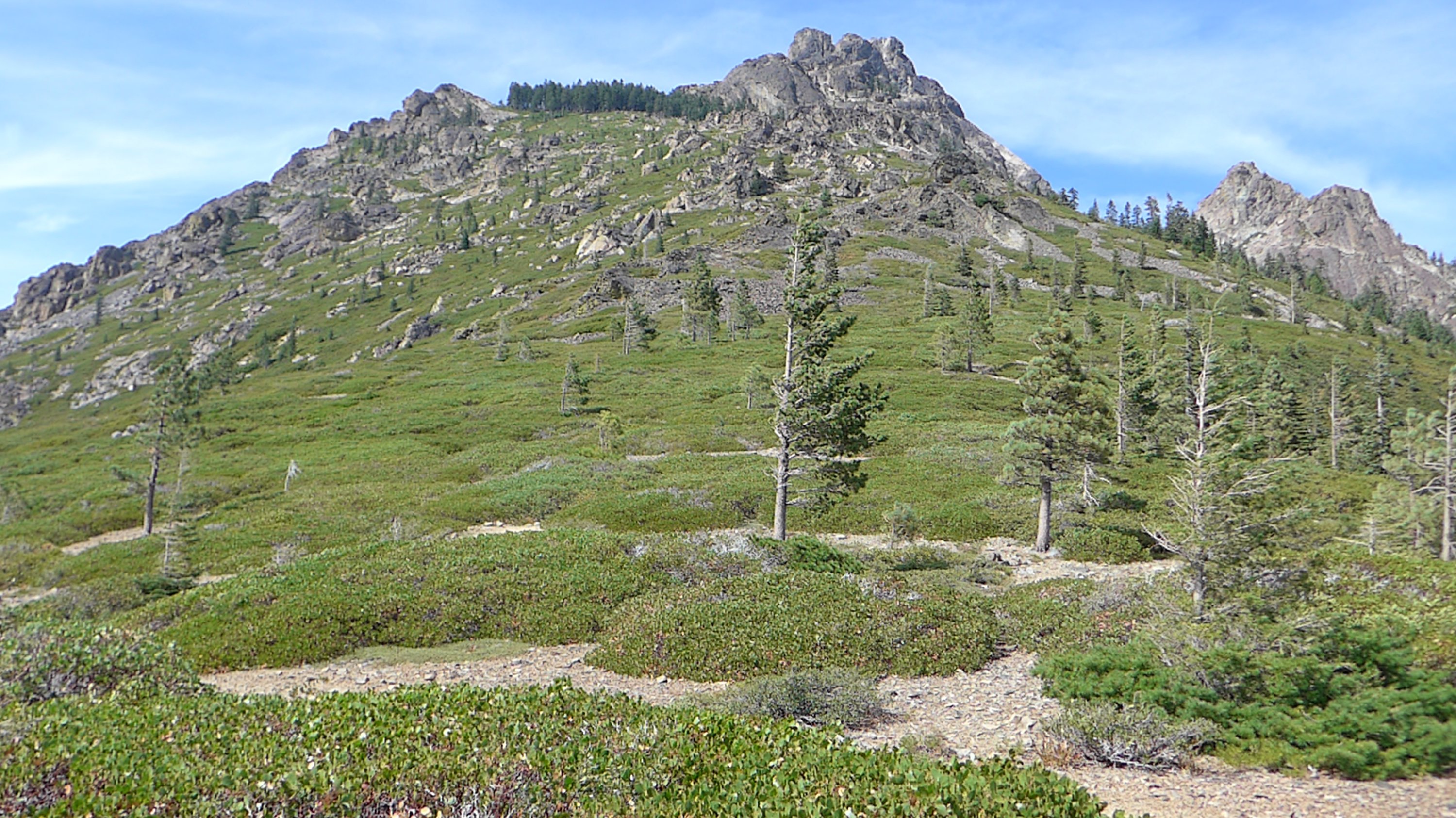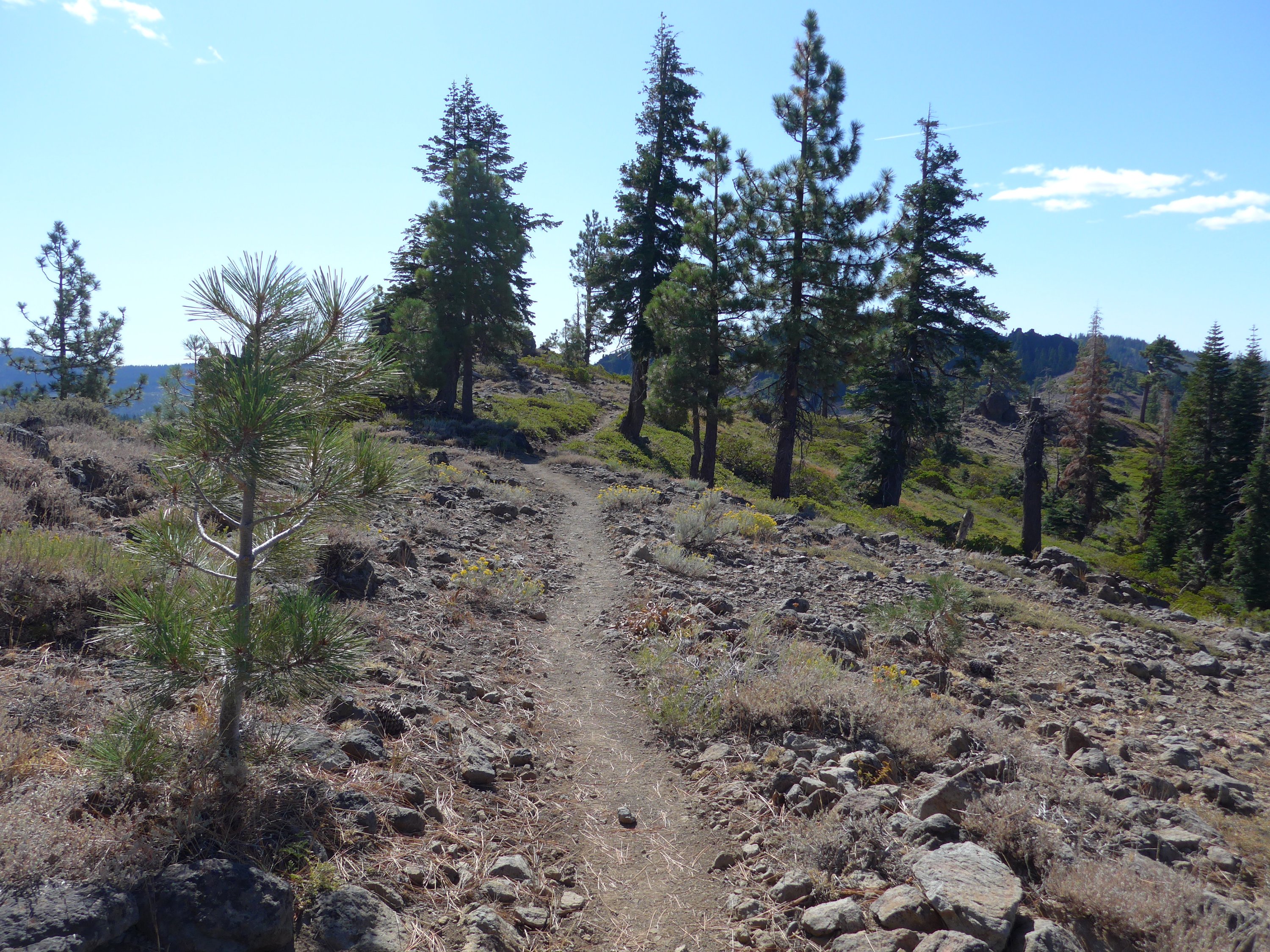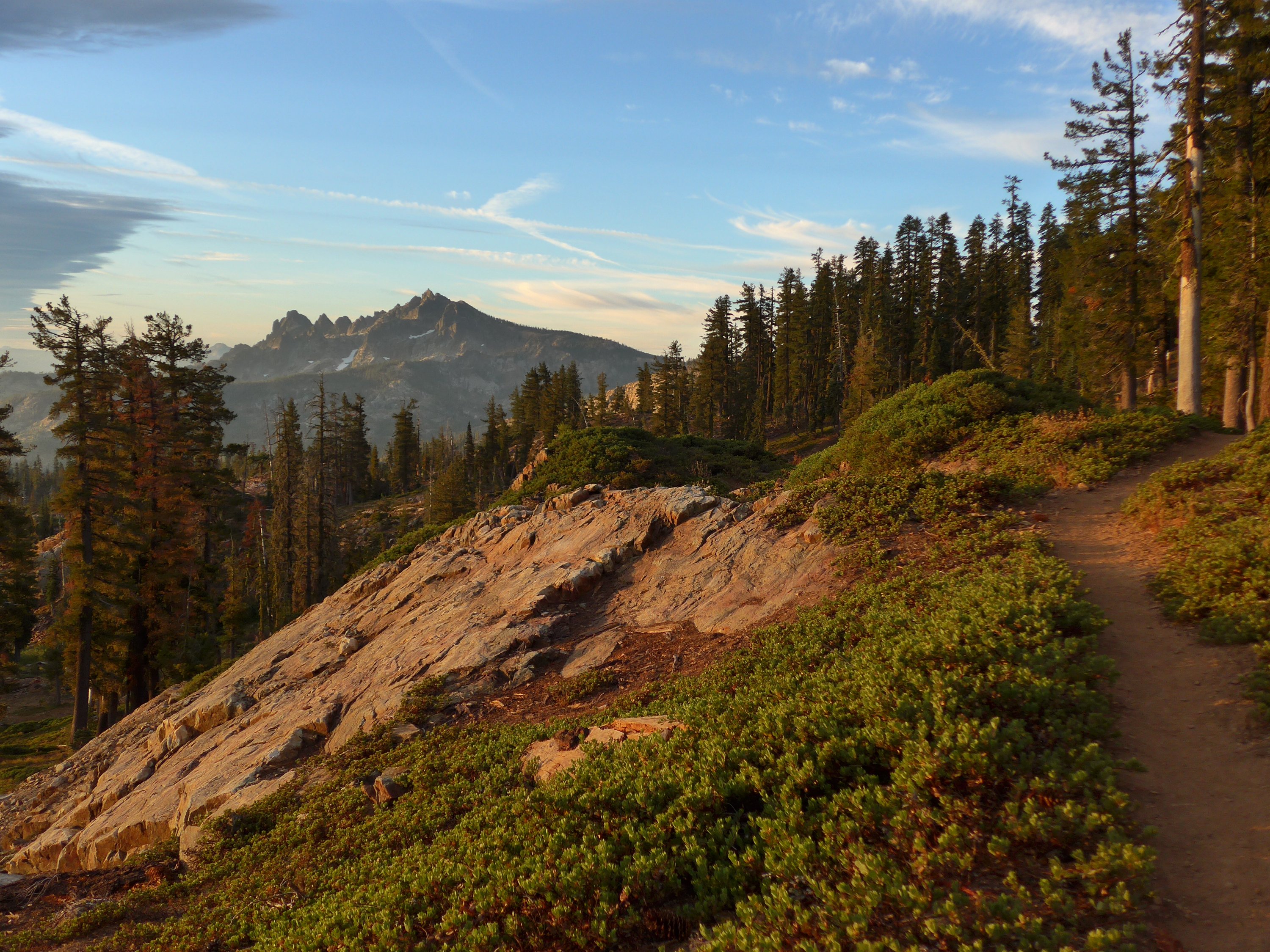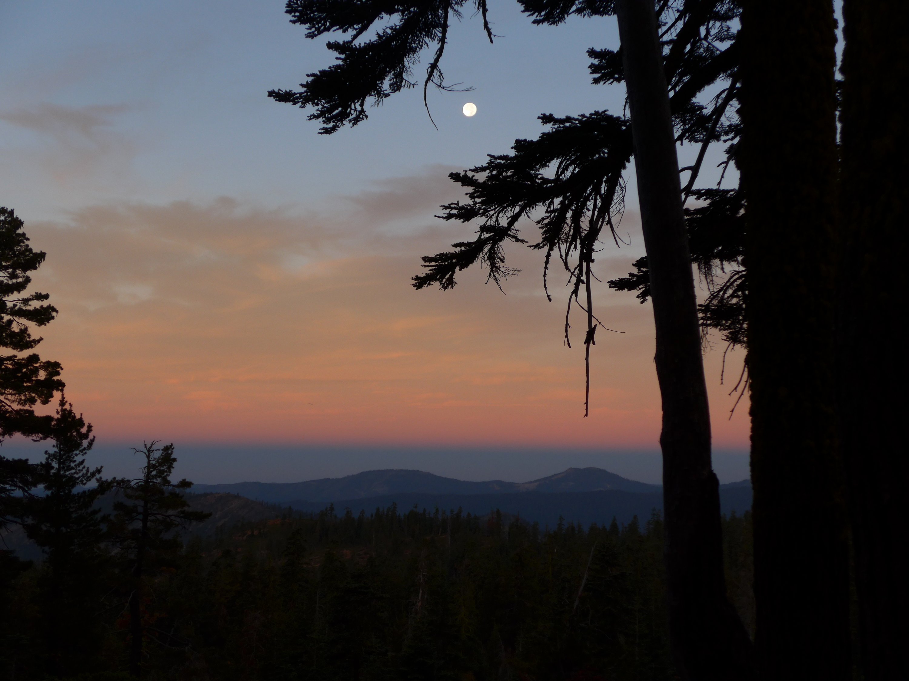 Der Morgen beginnt mit einer heftigen Achterbahnfahrt, laut Karte geht es auf und ab, es fühlt sich aber wie ein endloses Bergauf an. Endlich habe ich den Rauch hinter mir gelassen. Beim Mittagessen beobachte ich das schnellste Chipmunk der Welt: Es flitzt über den Boden, springt über Felsen, rast über Äste, um schließlich senkrecht einen Baum hoch zu sausen. Der kleine Körper scheint zu fliegen, die winzigen Pfötchen berühren kaum den Boden, ich bin tief beeindruckt! Die waldigen Hügel verwandeln sich im Laufe des Tages in Berge. Und plötzlich bin ich mittendrin im Gebirge!