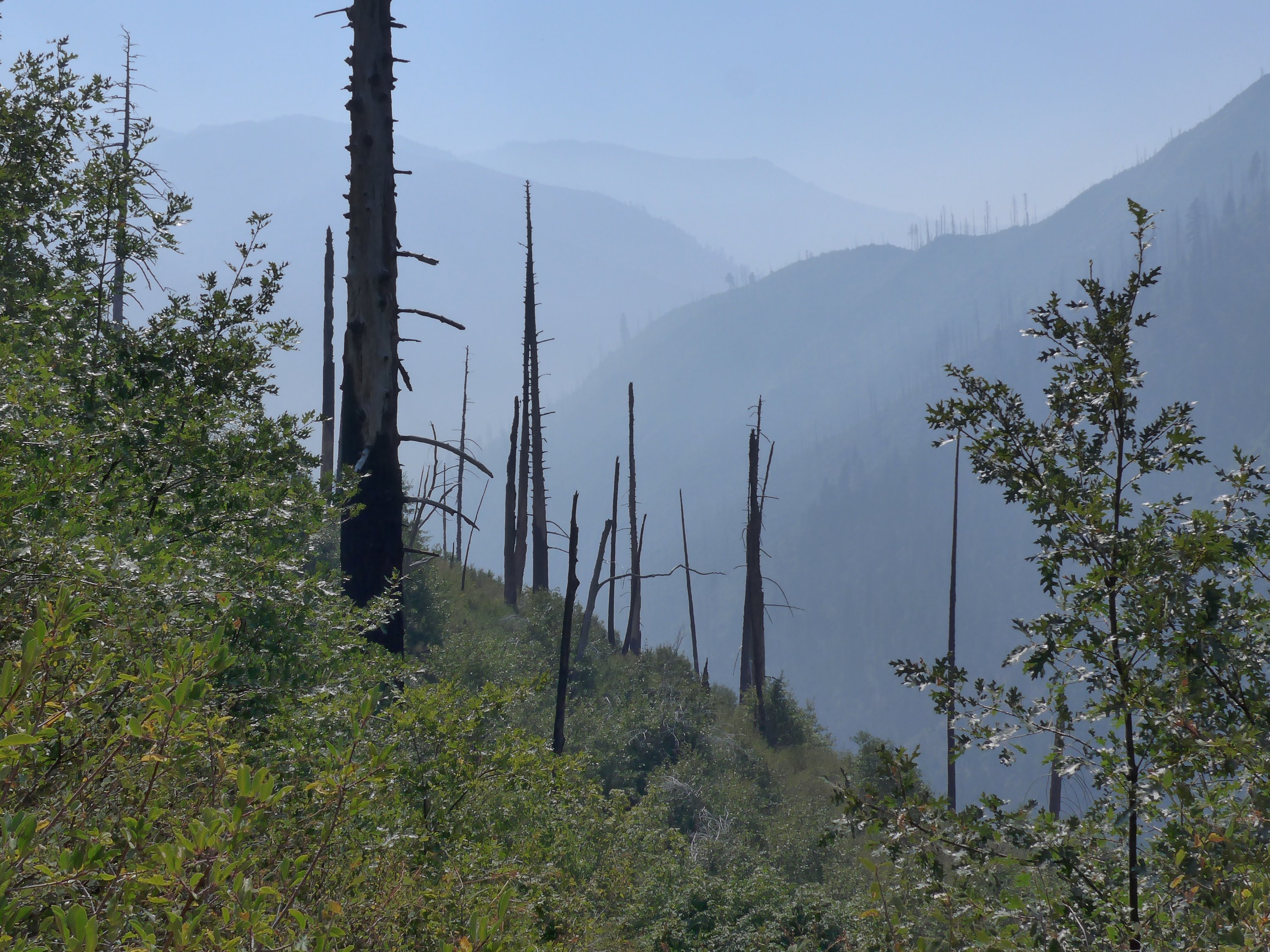 Es geht viel rauf und runter. Die Aussicht wird leider immer mehr von Rauch vernebelt, was von einem Waldbrand herrührt. Insbesondere im Tal, in das ich nun absteige, hängt der Rauch und kratzt in Augen und Nase.