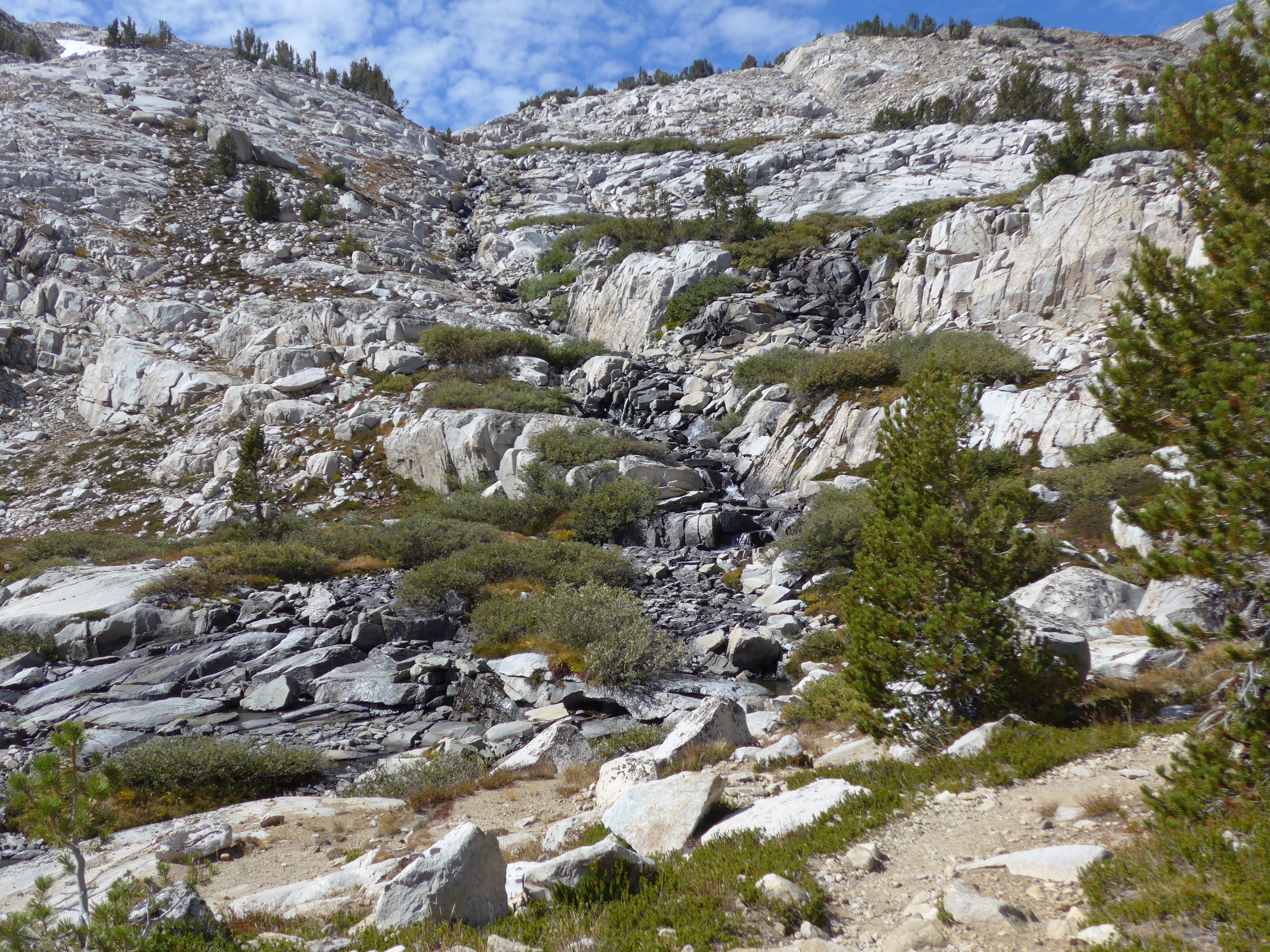 Weiter geht es bergauf am berüchtigten Evolution Creek entlang. Dieser ist zur Zeit der Schneeschmelze richtig gefährlich, vor zwei Jahren ist eine Hikerin hier ertrunken… Für uns ist die Querung einfach, das Wasser ist nun kaum knöcheltief. Es fällt manchmal schwer sich vorzustellen, durch welche Gefahren sich die Wanderer hier noch vor nur 2 -3 Monaten gekämpft haben, mit Schnee und reißenden Flüssen… Ich war ja geflipped, bevor ich auf die richtig drastischen Passagen gestoßen wäre.