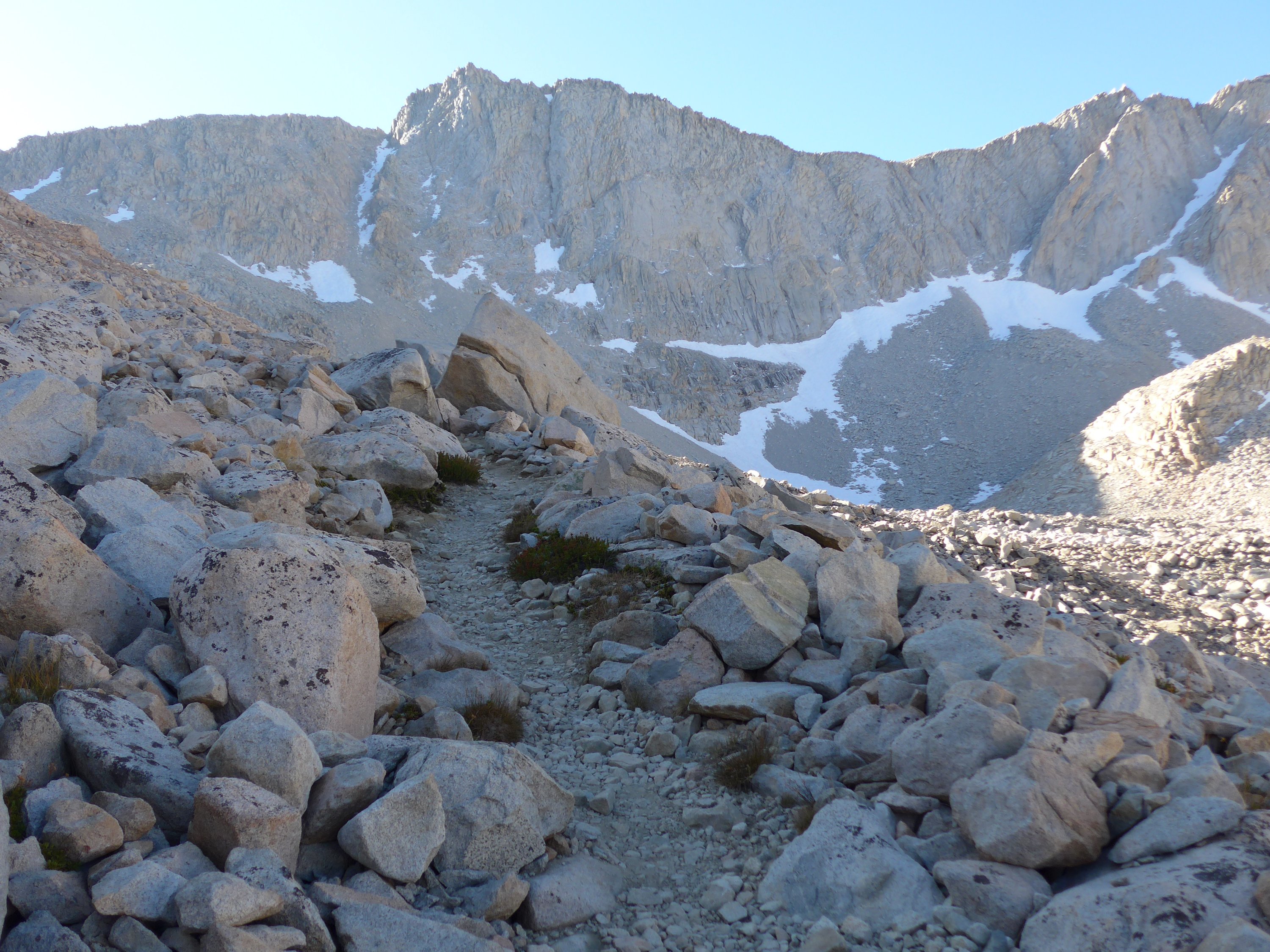 Direkt geht es heute steil die „golden Staircase“ hinauf zu Mather Pass. Die Berge bestehen hier aus schneeweißen Steinen, die bis in den wieder leuchtend blauen Himmel ragen. Ich fühle mich wie Hans Wundersam, der eine steile Stiege in den Himmel empor klettert um einen kleinen Engel zurück nach Hause zu bringen… Der Aufstieg will schier kein Ende nehmen, aber schließlich oben angekommen ist die Aussicht auch wirklich wieder Mal himmlisch!