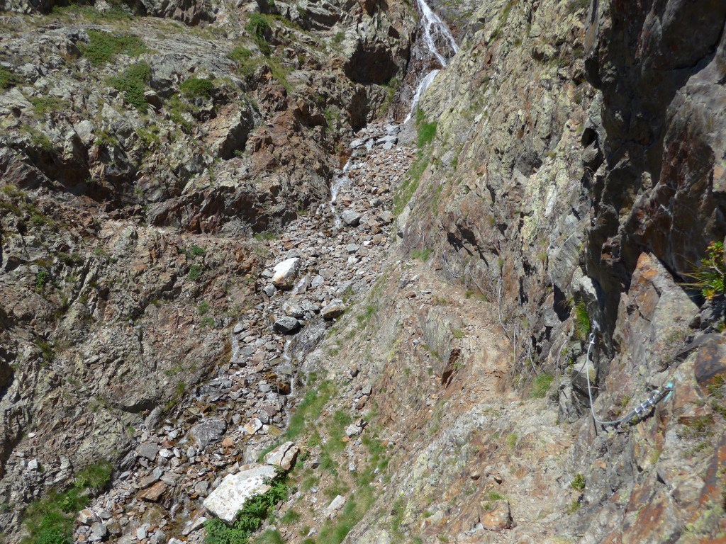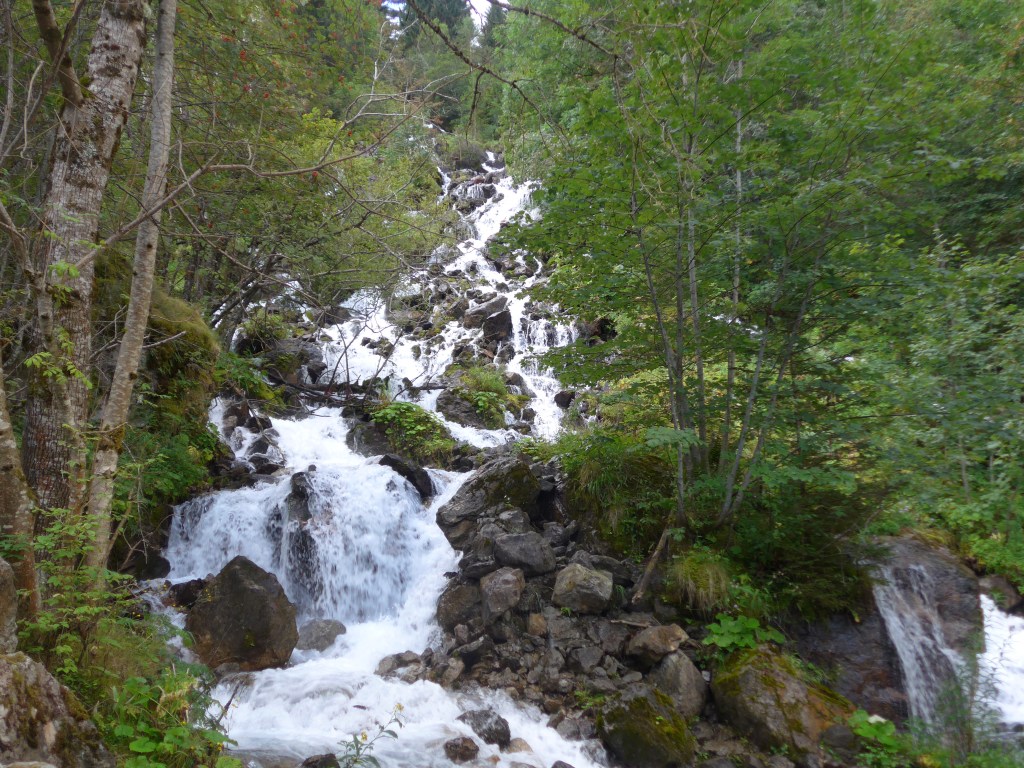 Morgens ist das Zelt von der Kondensation klatschnass, aber es verspricht ja wieder ein sonniger Tag zu werden. Von unserem See aus geht es bis nach Bourg d’Oisans nur bergab. Zunächst über einen schönen Pfad entlang eines tollen Wasserfalls, später leider überwiegend den Radweg folgend, also auf Teer.