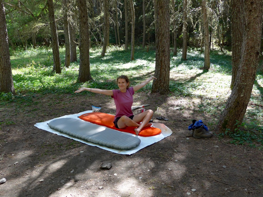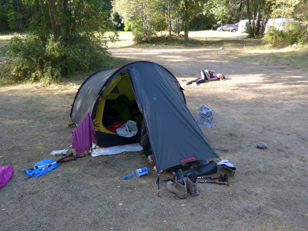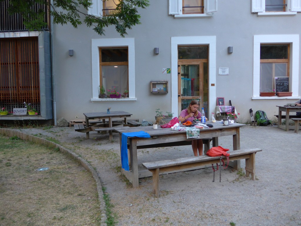 Unten im Ort Le Desert en Valjouffrey angekommen ist es schon 6 Uhr, wir haben gerade Mal 17km geschafft. Wir suchen lange nach einer „wilden“ Zeltstelle, aber überall sind Ziegen und ihre kläffenden Hütehunde. So schleichen wir den Hügel wieder hinab ins Dorf, die Köpfe hängen fast auf unsern Knien. Plötzlich eine Mini-Schlange direkt unter Evas Füßen! Beide geraten in Panik, Eva hat wohl doch noch ein winziges bisschen Energie, steht plötzlich senkrecht und springt kreischend im Dreieck… Zum Schlafen landen wir bei der Herberge Gite d’etape, wo man für 5€pP im Garten zelten kann. Die Dusche entschädigt für den unglaublich anstrengenden Tag.