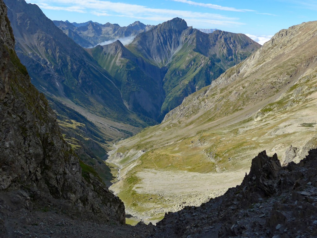 Ab dem Pass Col Saint Georges führt der Weg wunderbar über eine Hochebene. Einfaches laufen mit phänomenalem Blick auf die schroffen Berge hinter La Grave. Der ganze Höhenzug wird von einem Gletscher bedeckt. Diese Aussicht begleitet uns auch den Rest des Tages und ist ein wunderbares Abschiedsgeschenk.