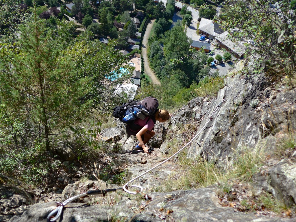 Dann wollen wir noch etwas weiter laufen, um nicht auf den völlig überteuerten Campingplätzen schlafen zu müssen. Wie kann es anders sein stellt sich der Aufstieg aus den Tal als richtige Klettertour heraus. Es wäre ja wohl auch kein richtiger GR45 Tag, wenn wir nicht wenigstens einmal in Drahtseilen hängen und um unser Leben zittern würden. Zur Abwechslung sind diesmal die Drahtseile halb durchgerostet und der „Pfad“ mit Dornen überwuchert.