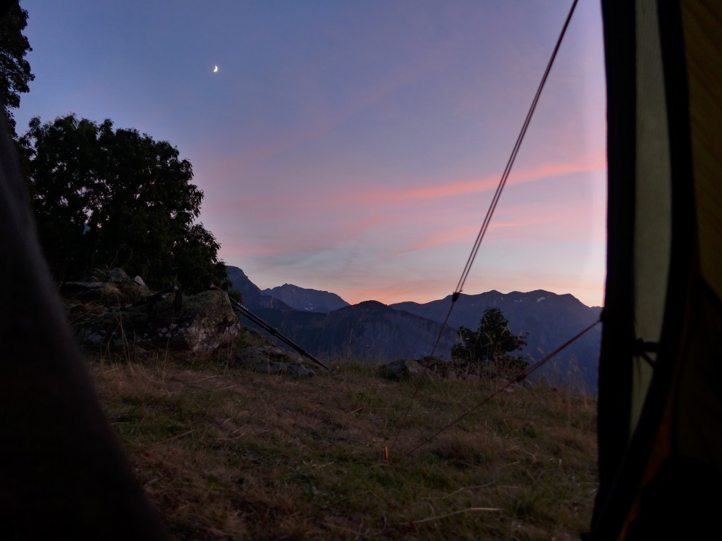 Oben angekommen stellt sich heraus: Es gibt eine durchaus bequemere Alternativroute (großteils entlang der Straße). Aber wir klugen Sparschweinchen laufen ja nur nach GPS Track, und nicht mit dem offiziellen Guidebook.. ist ja so auch viel spannender! 😉 Es geht noch einige Kilometer durch Wald den Berg hoch, dann finden wir direkt hinter dem Ort Le Rosai an einem Hang den bisher schönsten Zeltplatz überhaupt: Mit Blick auf das 500m unter uns liegende Tal und die hohen Berge auf der anderen Seite, aus denen wir heute früh runter kamen. Was für ein Tag!