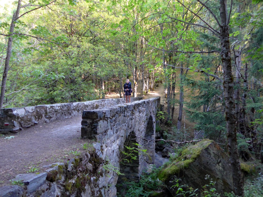 Auch heute früh können wir uns kaum aus dem Schlafsack pellen, es ist einfach zu schön im Schlafsack liegend die grandiose Aussicht zu genießen. Zunächst geht es leicht bergab zum Flüsschen La Sarenne, wo Überreste alter Mühlen romantisch verstreut liegen. Entlang des Flusses dann stetig sanft bergauf, in Vergleich zu den letzten Tagen ein wahrer Spaziergang.