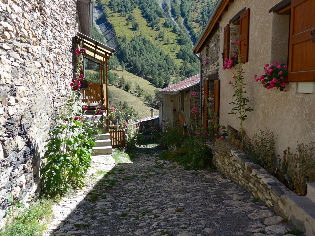Danach geht es bergab bis in die hübschen Dörfchen Clavans le Haut und Clavans le Bas, wo wir auch Mittag essen. Dann geht es steil hinauf zum Ort La Besse. Es ist heiß, wir schwitzen arg. Auf den Armen bilden sich inzwischen immer wieder Pusteln durch Sonne und Schweiß. Doch La Besse ist schnell erreicht. Ein wirklich äußerst schönes Örtchen, vollkommen aus Bruchstein gebaut, überall Blumen. Wir gönnen uns ein Eis und eine Pause im Schatten.