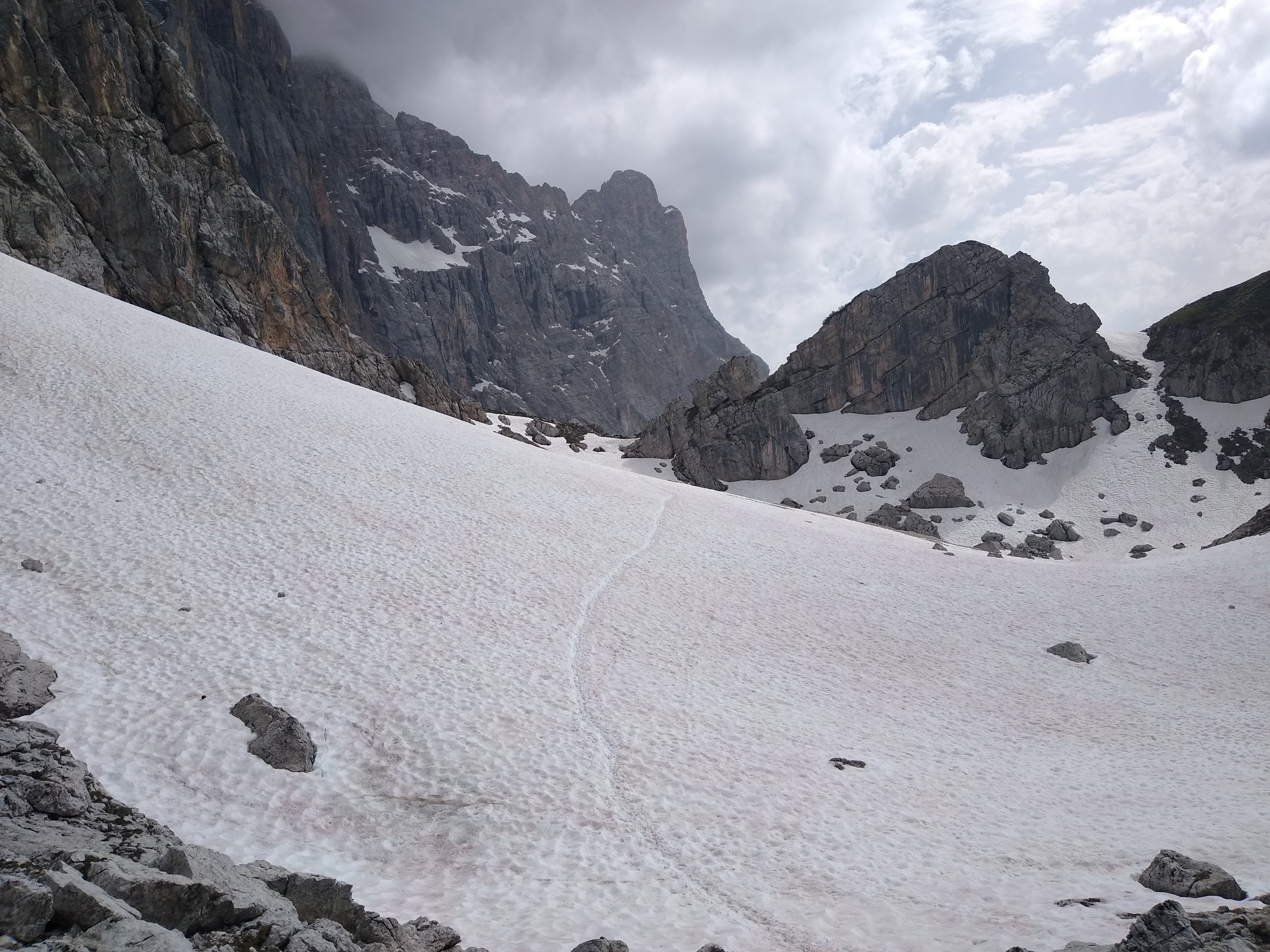 Nach der wohlverdienten Pause geht es nochmal etwas hoch bis zum See Lago Coldai, in dem noch Eisschollen schwimmen! Der Weg danach wird doch noch wieder Mal eine Herausforderung. Viele steile Schneefelder sind zu queren. Ohne Microspikes wäre ich hier nicht weiter gekommen, und auch so schiebe ich mich in Mopsgeschwindigkeit den Hang herunter…