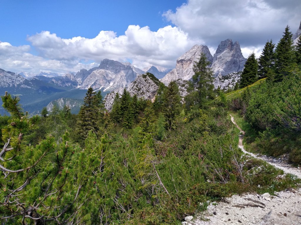 Wieder einmal ist es sehr heiß. Zur Mittagspause haben wir das Refugio Malga Moschesin eingeplant -und müssen zu unserem Ärger feststellen, dass es geschlossen hat. Wasser können wir so auch nicht nachfüllen. Weiter geht es bergauf. Zum Glück stoßen wir kurz vor dem Gipfel auf eine Quelle! Nun sind es nur noch wenige Kilometer bergab zum Refugio Sommariva Pamperet. Wie gönnen uns eine ausgiebige Pause. Denn danach steht der einzige Abschnitt der gesamten Tour an, der aufgrund von Steilheit und Schwierigkeit als „alpin“ gekennzeichnet wurde.