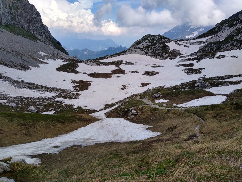 Bald wird mir diese Sorge genommen, den dicke Wolkem ziehen auf und die Blickweite begrenzt sich auf wenige Meter. Nach zwei Stunden haben wir den höchsten Punkt erreicht! Nun geht es steil bergab. In tip-top Schritten kriechen wir bergab. Schließlich geht der Schnee in Gras über, die Spikes können wieder ausgezogen werden. Hoffentlich zum letzten Mal! Aber Pustekuchen, leichter wird es dadurch nicht! In stellen Serpentinen geht der Weg weiter bergab, und Schotter und Felsblöcke sind eher noch rutschiger als der Schnee. Plötzlich gibt es vor mir einen Schlag, und ich sehe Kevin kopfüber den Steilhang herab rollen. So eine Scheiße! Nach zwei Meter Sturz kommt er zum Glück auf einem kleinen Grasabsatz zum liegen. Glück im Unglück! „Nur“ ein aufgerissener Daumen und ein angeschlagenes Knie. Notdürftig versorgen wir die Wunden, und es geht weiter.