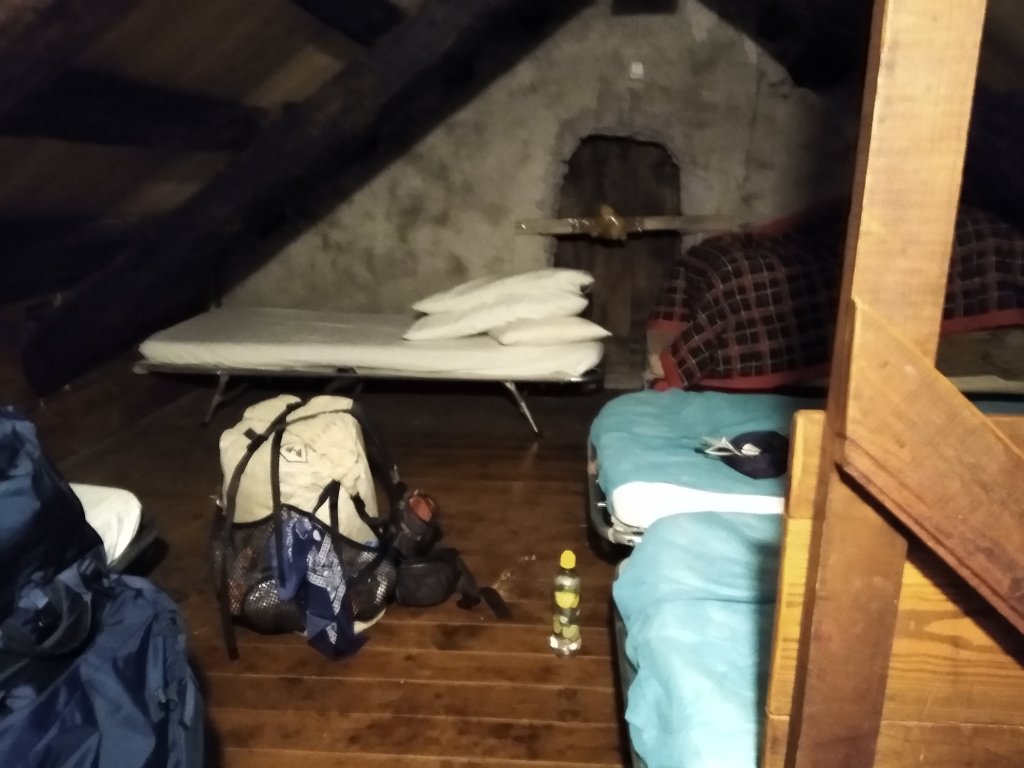 Es ist nur noch ein Kilometer bis zur Hütte, aber so steil dass wir dafür eine geschlagene Stunde brauchen, und ich mehrere Herzinfarkte erleide. Gerade nach dem Sturz bin ich noch vorsichtiger geworden. Endlich gehen 8 Uhr erreichen wir das Refugio Pian de Fontana. Es ist ausgebucht. Aber wir dürfen auf dem Dachboden einer Hütte schlafen. Was für ein Tag!